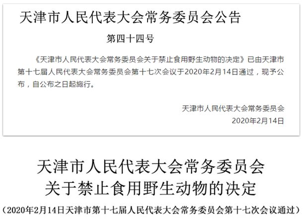 天津日报讯:为了保障人民群众生命安全和身体健康,倡导科学健康文明的生活方式和饮食习惯,保护野生动物资源,维护生态平衡,根据有关法律、行政法规,结合本市实际情况,作如下决定:
